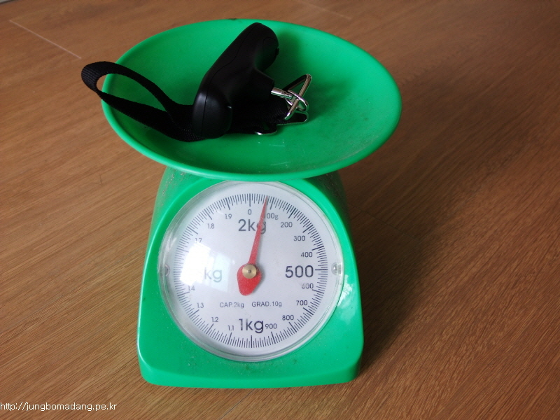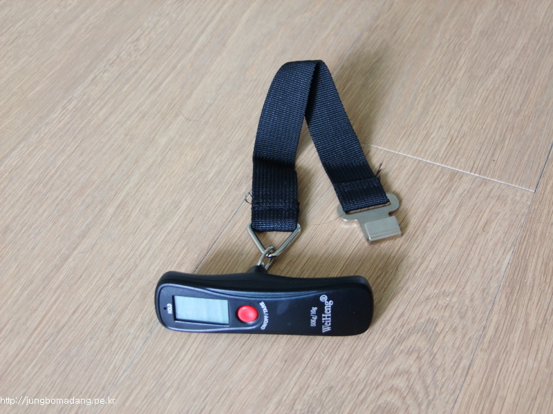 테스트로 제 자장구용 가방을 달아봅니다. 무게 달때 저울 아래 벨트를 고리에 감아서 측정하면 됩니다. 그리고 몇초 기다리시면 HOLD에 빨간 불이 들어오는 데, 이때 무게가 고정되서 표시되므로 제품을 내려놓아도 됩니다.