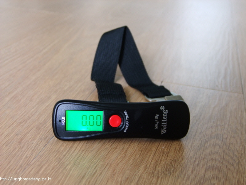 테스트로 제 자장구용 가방을 달아봅니다. 무게 달때 저울 아래 벨트를 고리에 감아서 측정하면 됩니다. 그리고 몇초 기다리시면 HOLD에 빨간 불이 들어오는 데, 이때 무게가 고정되서 표시되므로 제품을 내려놓아도 됩니다.
