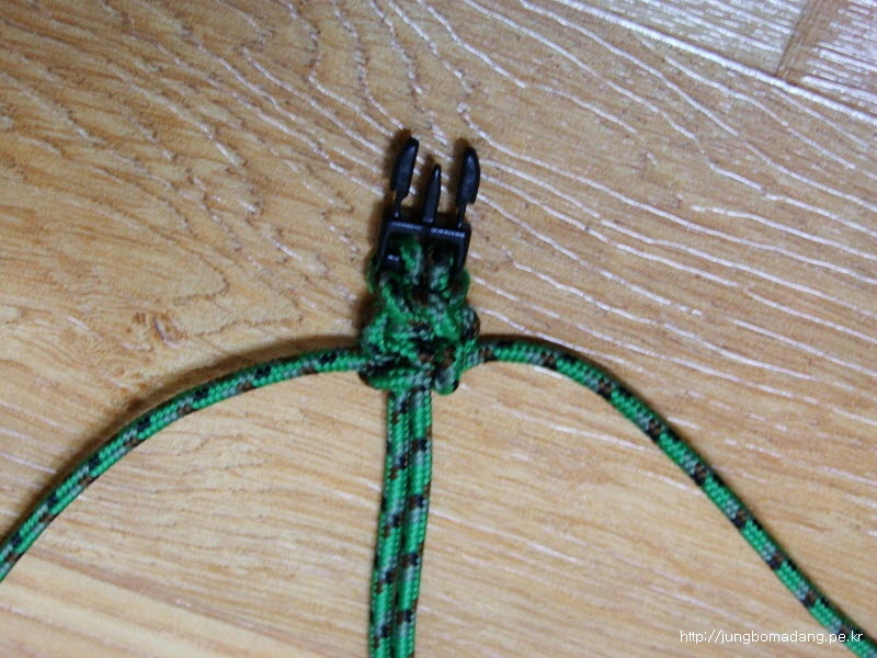 우선 낙하산 줄을 반을 접어서 접힌 부분 끝을 아래와 같이 버클 한쪽에 끼웁니다.