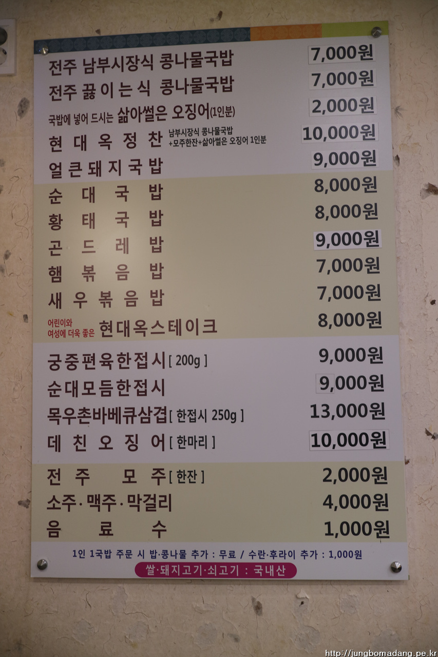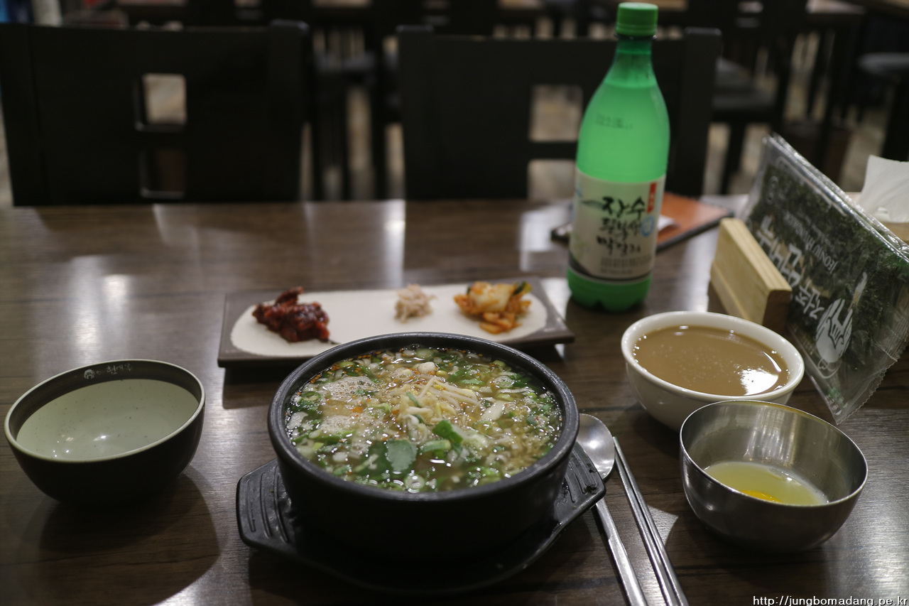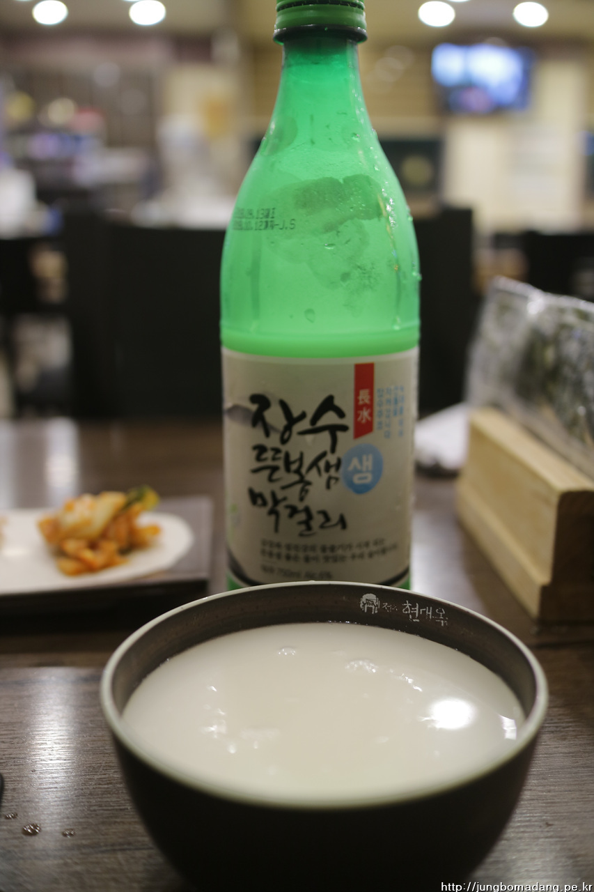 01;00 두둥 현대옥 도착! 무려 1시간의 시간이 확보 되었네요. ^^ 사장님(이모님으로 추정)이 디게 친절하십니다. 멀 먹을지 고민하니 젤 윗 음식을 추천해주십니다. 막걸리 한병, 그리고 모주도 한잔 추가합니다. 아시다 시피 모주는 도수 2도짜리로 계피가 추가되어 계피향이 좋습니다.