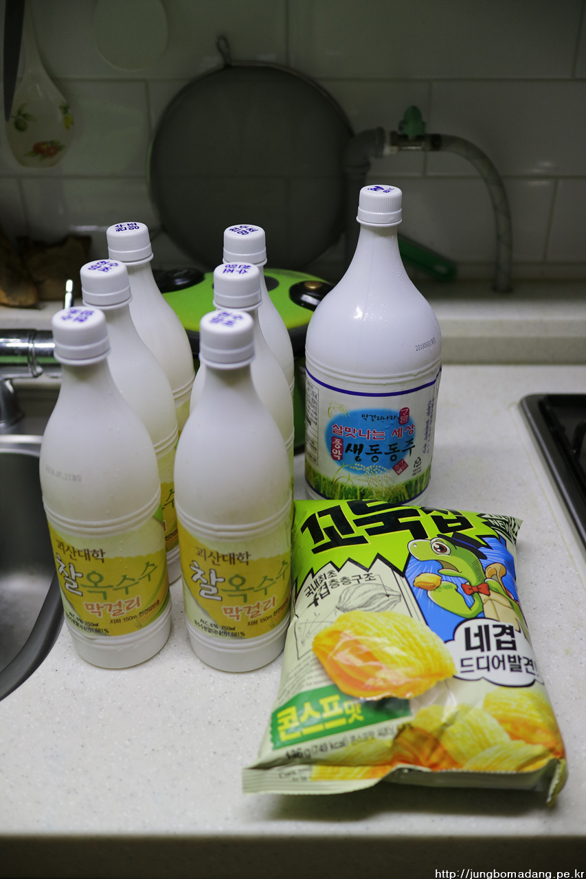 오늘 겟한 막걸리입니다. 꼬북칩도 얼떨결에 ㅋㅋㅋ. 꼬북칩은 네겹지만 마깔리는 네병이 넘는다카이~