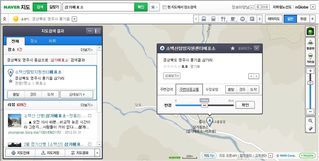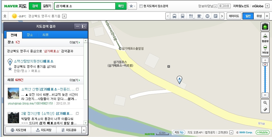 좌측으로 검색된 결과(소백산탐방지원센터매표소) 링크를 클릭을 하면 아래와 같이 위치가 파악 되는 데,