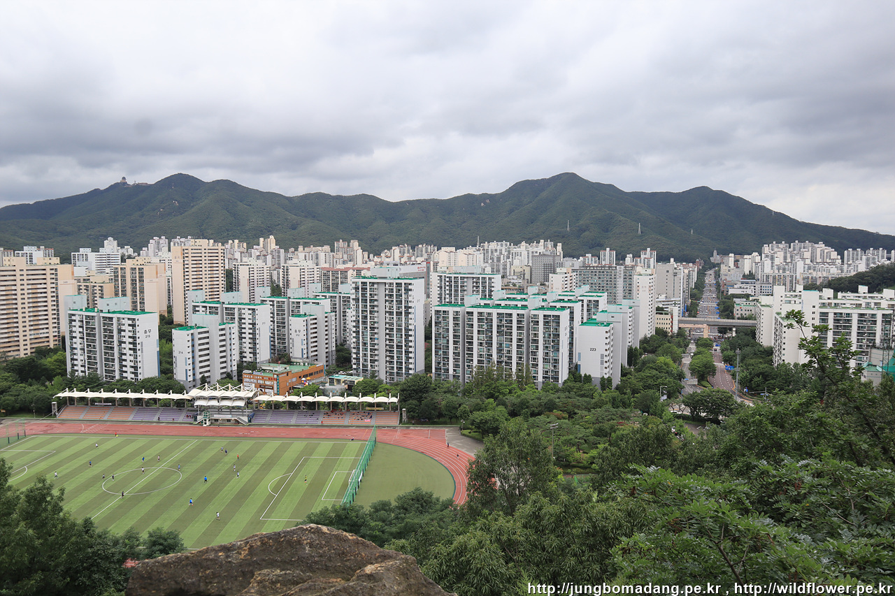 전망대에서 바라본 군포시민체육광장과 수리산 능선 좌측으로 부터 우측으로 슬기봉, 태을봉, 관모봉