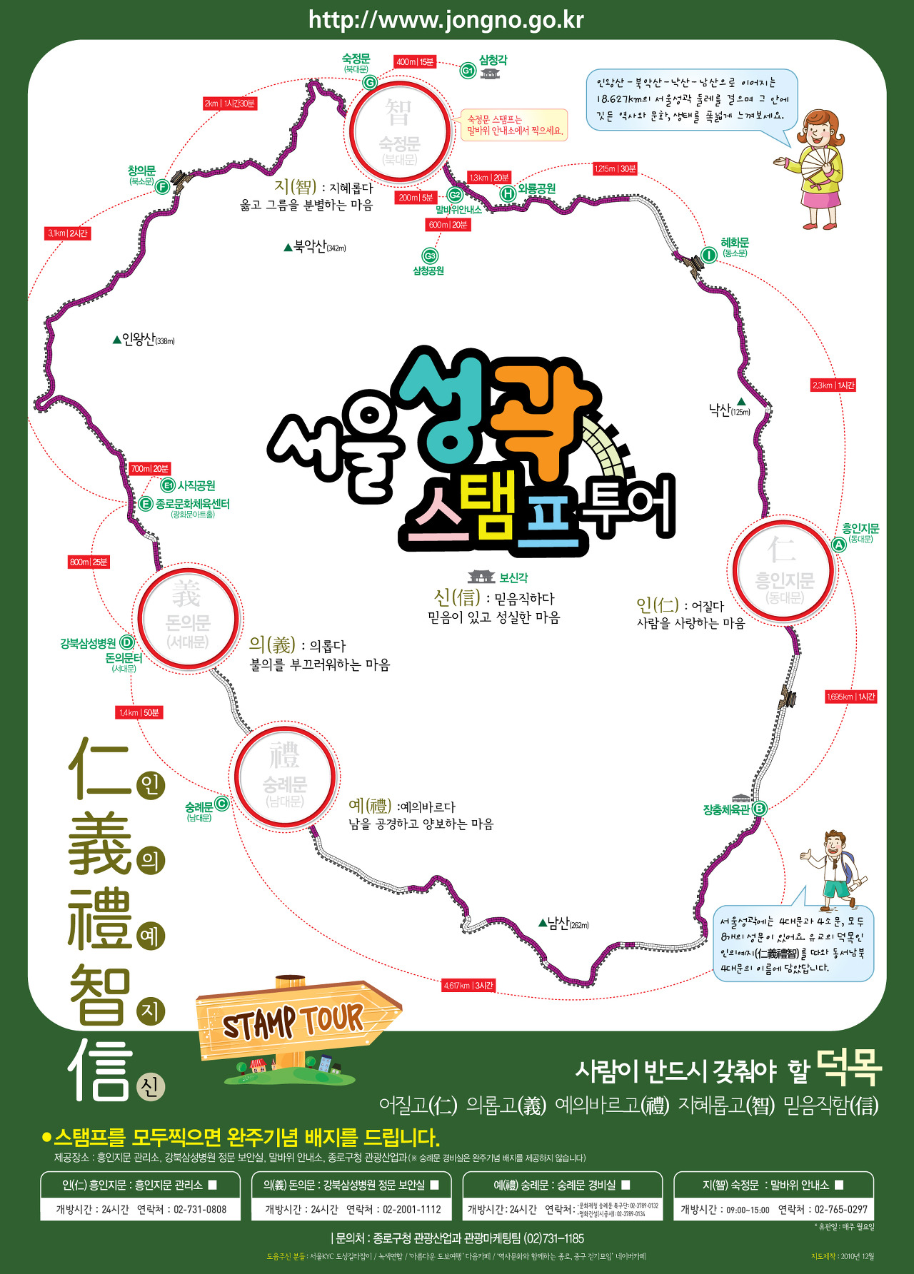 우리구에서는 조선시대 유교덕목인 인의예지를 따와 4대문의 이름에 담았던 의미를 스토리텔링하여 서울 성곽 스탬프투어를 운영한다. 서울성곽을 걷다가 4대문지점에서 4개의 스탬프를 모두 모으면 지정장소에서 완주기념 배지도 받을 수 있다.