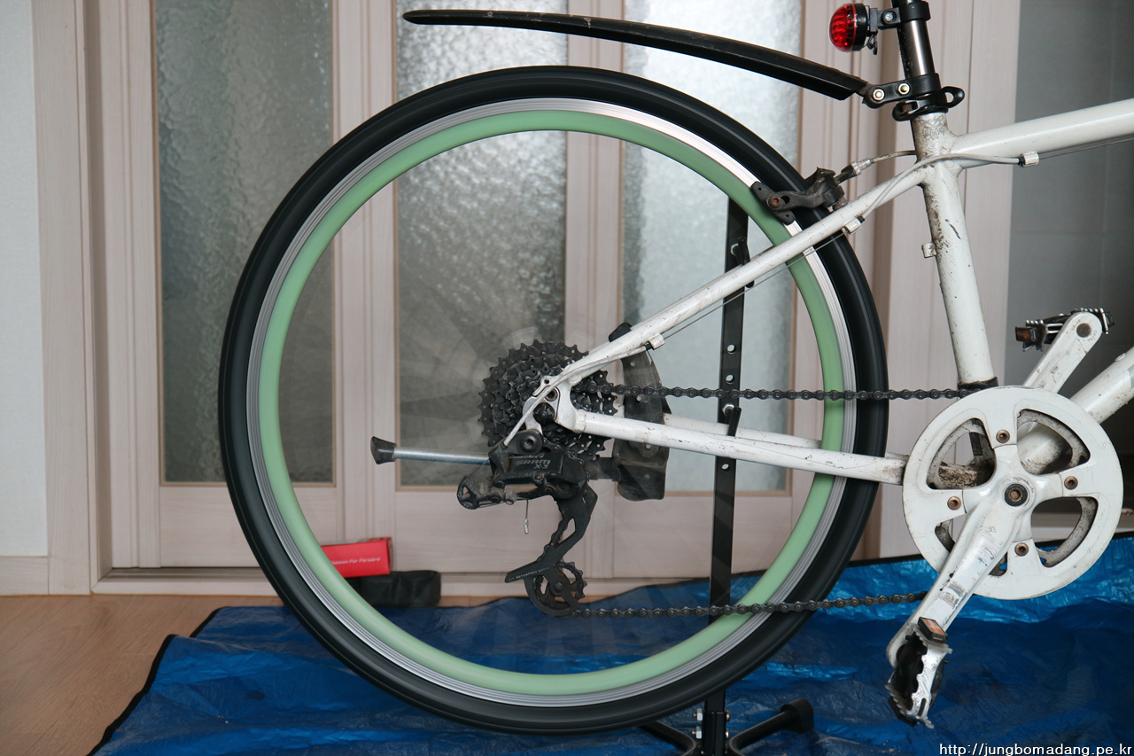 뒷바퀴 타이어가 퇴근길 주행중에 약 2센티정도 터져서 튜브 바람이 빠져 버려 집으로 질질 끌고 옴.