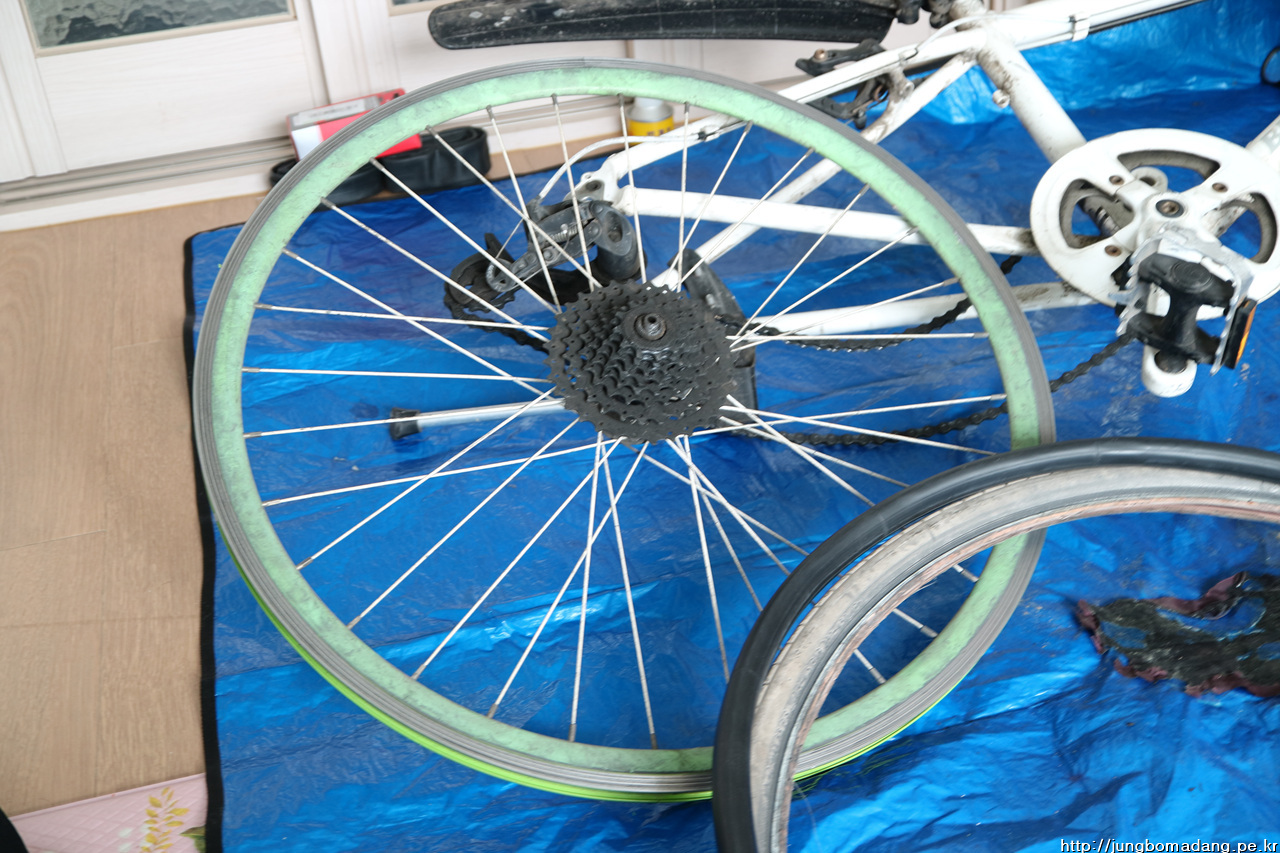 타이어를 교체하기 위해 거치용 스텐드로 뒷바퀴를 고정하고 기어를 스프라켓 가장 작은 걸로 맞춰서, 앞쪽에 걸린 체인을 풀고 QR레버를 푼 다음, 뒤에 변속에서 체인과 스프라켓을 살살 분리... 그래서 빼내면 요래... 그리고 튜브를 빼낸 상태구요.