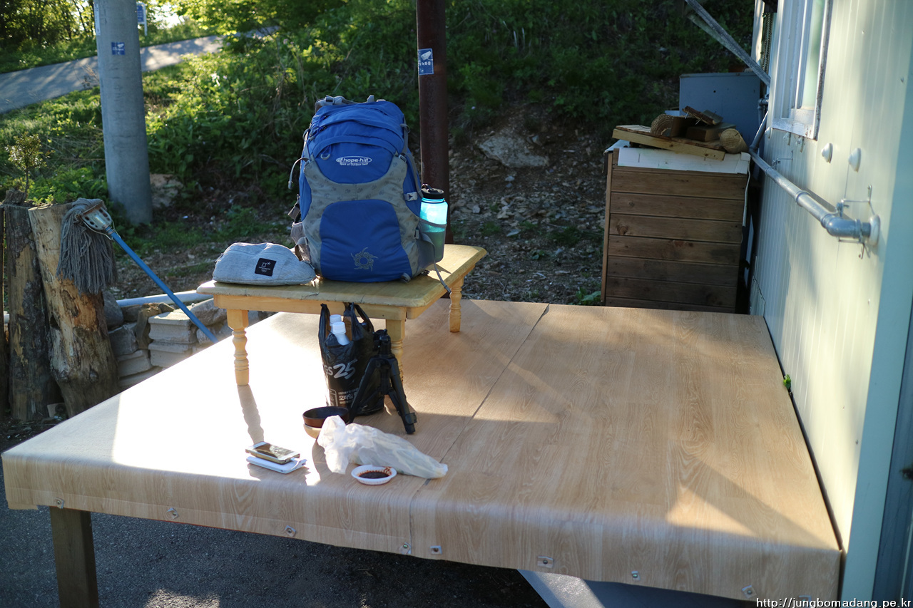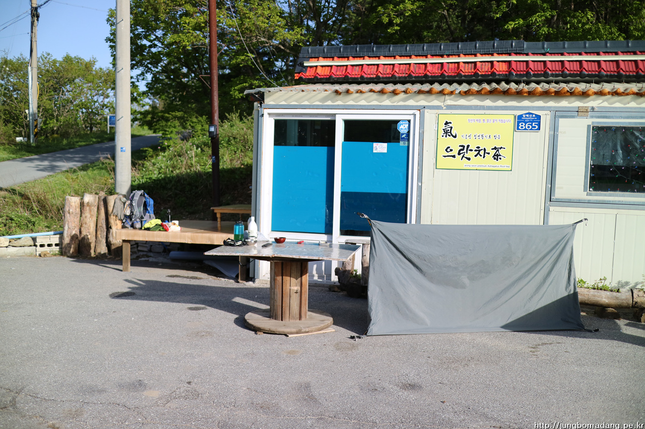 사장님께 살포시 부탁해서 쉼터 옆 평상에 텐트쳐도 되는 지 부탁하니 흔쾌히 허락하시네요!