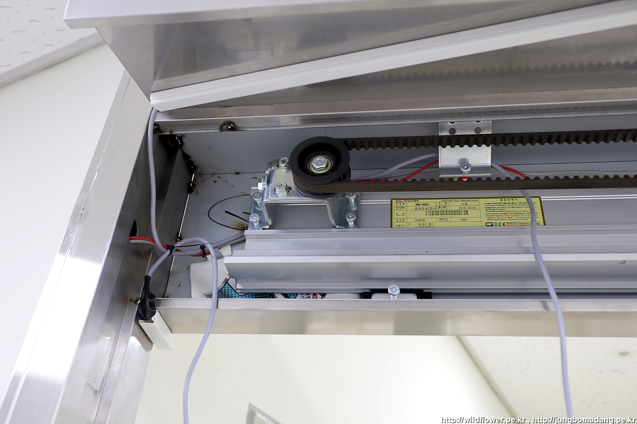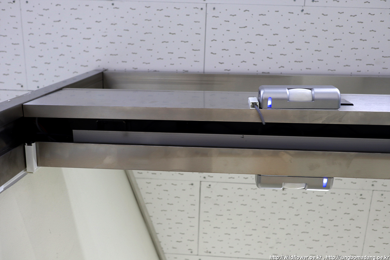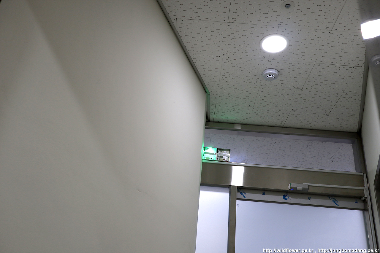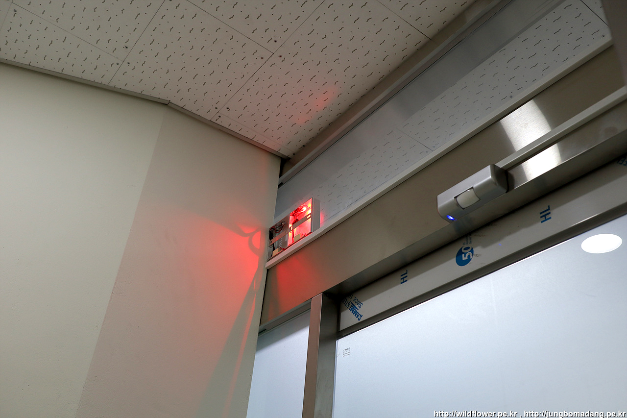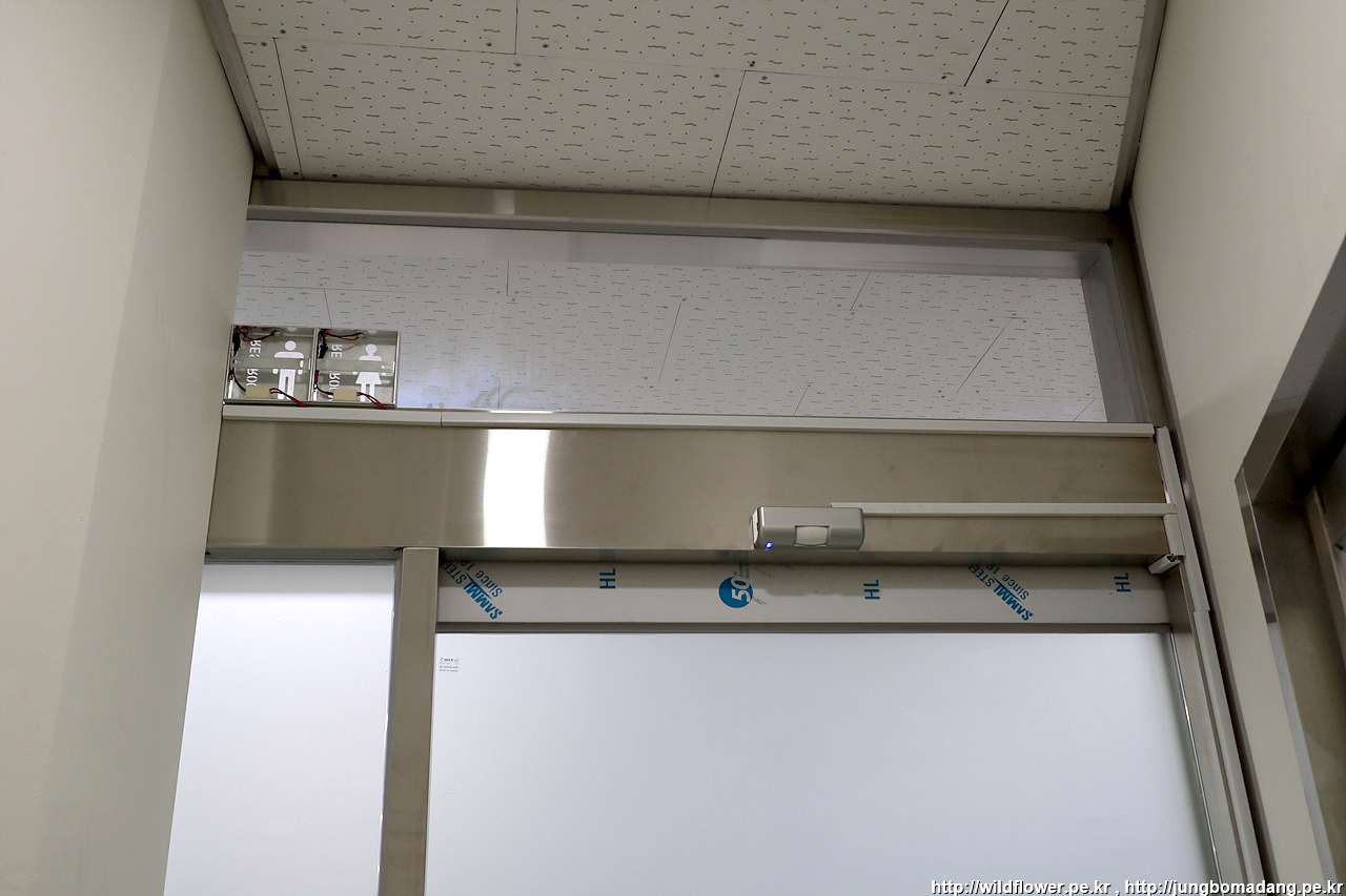 이렇게 문이 개방된 상태로 문 사이로 두개 자동문 센서의 설치된 모습입니다.