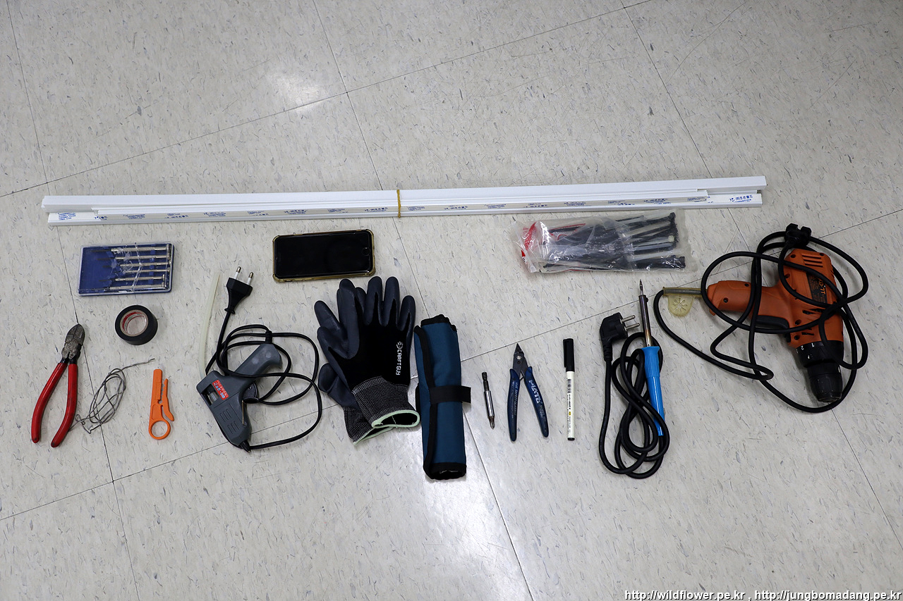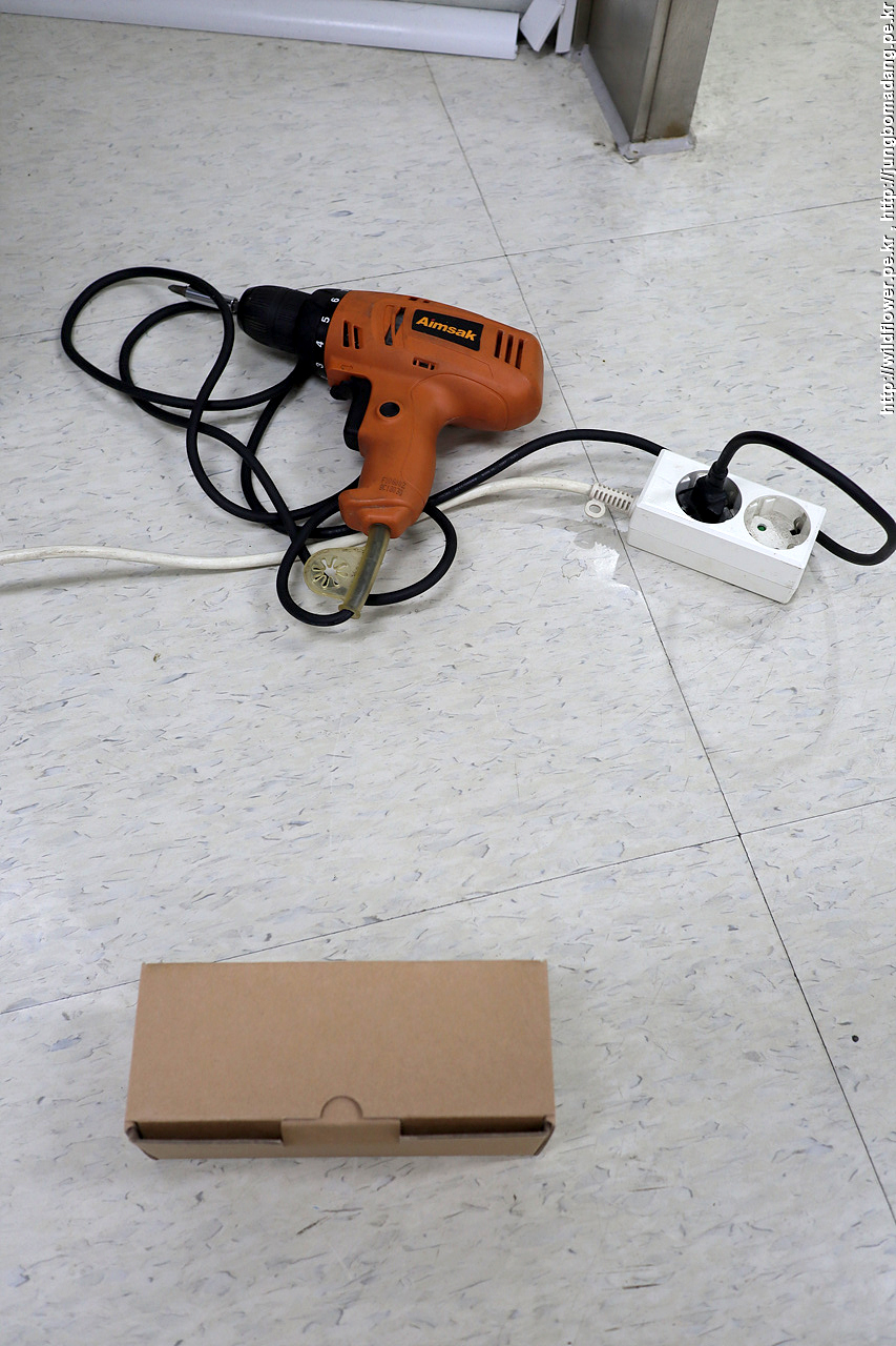 드릴로 설치할 곳에 고정용 피스 2개 그리고 배선이 빠질 구멍 하나를 뚫어야 하는 데 헉!! 뚫리지 않습니다. 잠시 고민하다 그냥 양면폼테이프로 부착하고 배선은 돌리기로 하고 요래 뚜껑 안쪽으로 쫄대 하나 대고 그 안으로 선을 넣습니다. 여기서 주요 포인트는 뚜껑을 열고 닫을깨 배선이 손상되거나 기존의 부품즐 동작에 방해되지 않게 해야하는 겁니다.