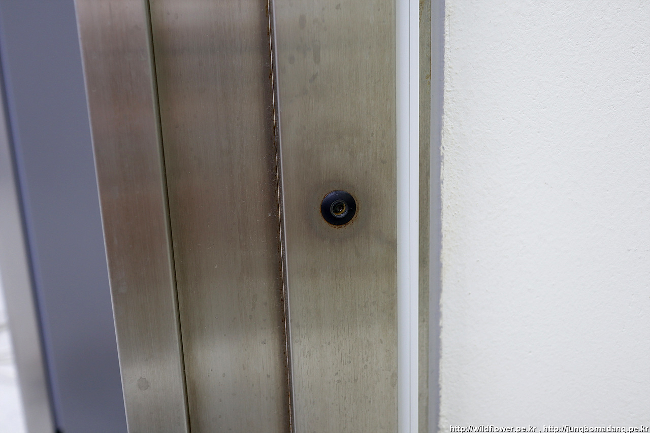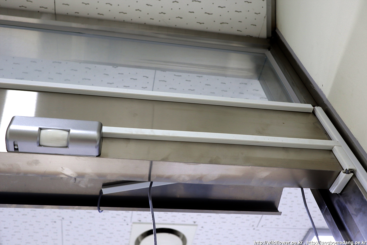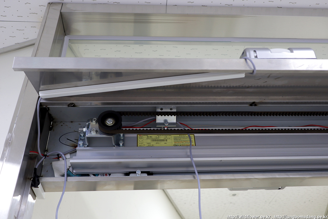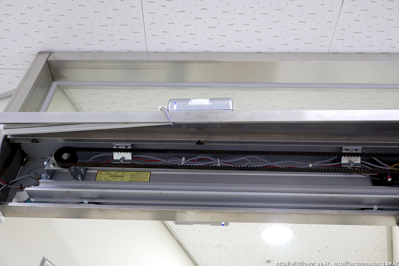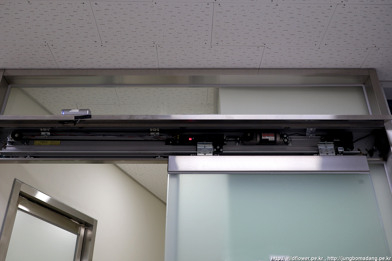 이렇게 문이 개방된 상태로 문 사이로 두개 자동문 센서의 설치된 모습입니다.
