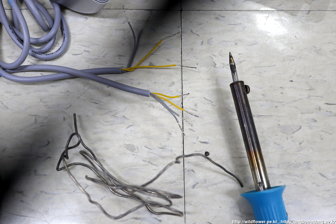 콘트롤러의 점퍼(노란색, 회색) 에 연결하기 위해 배선을 적당히 탈피 후 손으로 섬세하게 돌돌이를 하여 전선을 뾰족하게 만들고 풀림 방지를 위해 전기인두로 납을 먹입니다. 너무 두껍게 먹이면 점퍼에 결속이 안되니 아래와 같이 풀리지 않을 정도로 납을 전부 먹입니다. 아래는 납 막인 후 사진입니다.