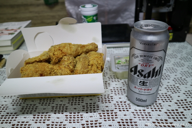그렇게 샤워(무릎에 냉수 분사) 후 맛나게 먹다 잠시 머리를 땅에 대었는 데, 눈을 떠보니 4기간이 흘렀네요 ㅋㅋㅋ 아놯~ 먹던 맥주는 마저 마무리 하고 본격적인 수면 시간을 가져 봅니다.