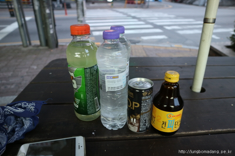 1차 행동식 보급. 참고로 이번 불수사도북은 별도로 매식을 하지 않고 논스톱으로 진행기로 합니다. 커피한캔, 컨피던스는 바로 섭취하고, 게또라이 1병, 생수 500ml 2병은 챙겨갑니다.