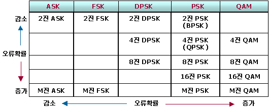 같은 진수인 경우에는 ASK보다는 FSK가, FSK보다는 DPSK거, DPSK보다는 QAM의 오류 발생