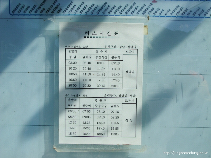 치악산국립공원에 전화 걸어도 버스시간 모르고, 원주 교통안내하는 곳에 전화해도 모르고... 다행히 033-734-9680에 연락해보니 장양리에서 08:40에 출발해서 09:05에 원주역을 지나는 것으로 알고 안심!!