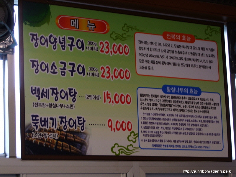 백세장어탕에 눈이 혹~ 했는 데, 2인이상 ㅠㅠ. 그래서 눈물을 맘으로 훔치며 뚝배기장어탕 주문.