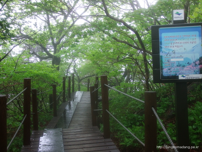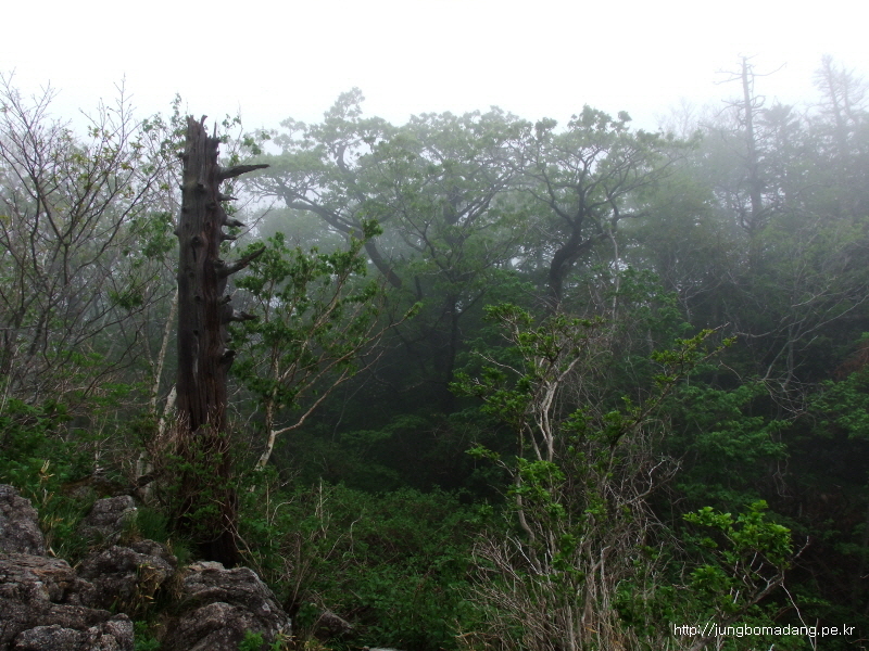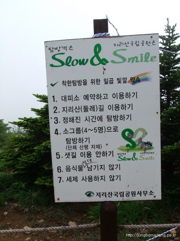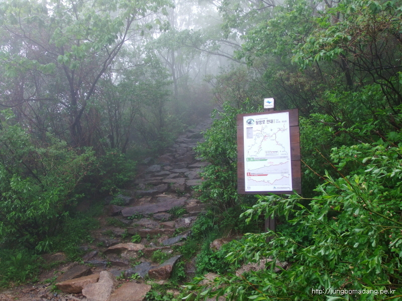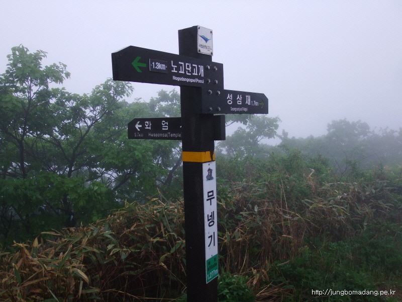 06:37 무넹기 도착!. 코가 땅에 닿을듯한... 그중에도 여기 600여미터 전부터 아주 죽이더라구요. ㅎㅎ 어쨌든 여기까진 2시가 30분 소요되었네요. 이제 노고단 대피소까지는 매우 착한길입니다... 아싸아~ ^^ 아싸는 개뿔.... 안개비가 좀 더 심해지고, 여긴 바람까지 불고 난리입니다....