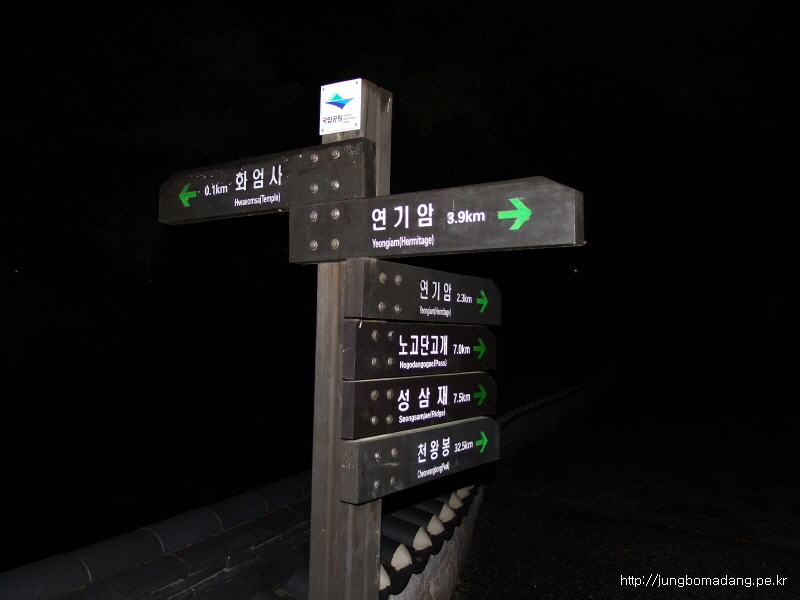 04:21 다리를 지나자 마자 좌측으로 오늘의 일정의 시작을 알리는 이정표가 보입니다. 노고단 고개까지 7Km, 천왕봉까지 32.5Km 와우~... 일단 노고단고개까지 4시간 예상해봅니다.