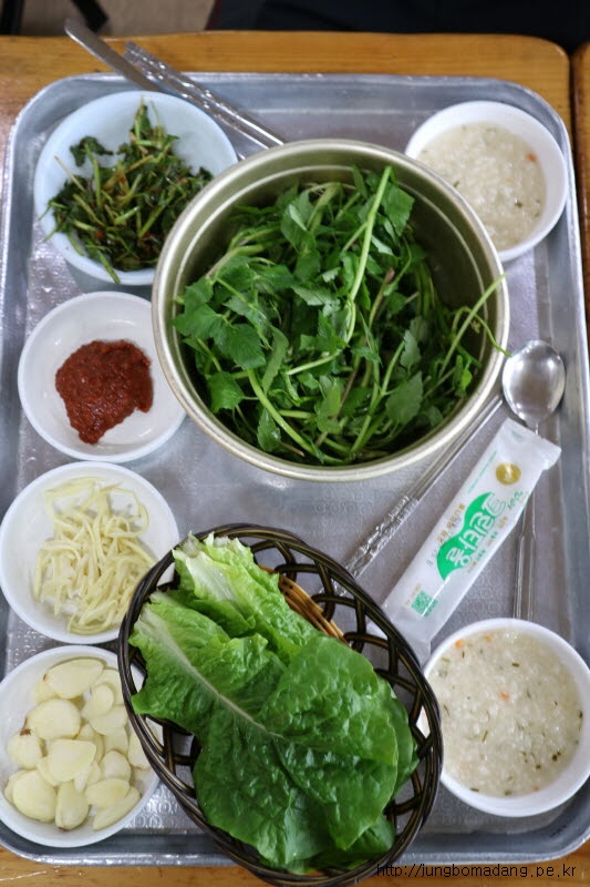 기본 상차림에 미나리, 상추, 쌈장, 미나리무침, 생강, 마늘은 셀프로 무한 리필되여~