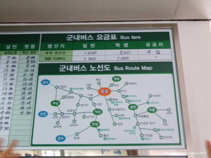 전 무주터미널에서 적상면으로 지나가는 10시 50분 버스를 이용하려 했기 때문에 무주터미널에 10시 20분에 도착하는 직통 버스를 이용하기로 합니다.