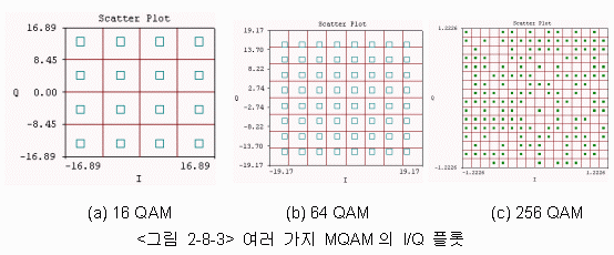 QAM은 사용하는 신호좌표의 양에 따라 여러 가지로 나누어지는데, MPSK와 마찬가지로 M-ary 방식이라서 QAM을 MQAM이라고 부르기도 하며 2의 승수에 해당하는 만큼의 신호를 사용한다. <그림 2-8-3>에는 일반적으로 많이 사용되는 MQAM을 보여주고 있다.