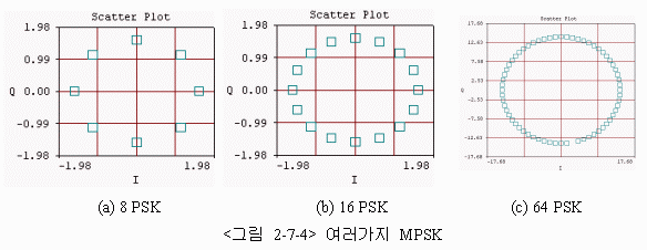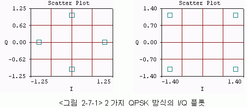 PSK 계열의 전송방식은 반송파의 전압, 즉 I/Q 플롯에서 신호들이 원점에서 떨어진 거리를 의미하는 반지름이 일정하기 때문에 위상만으로 신호의 내용을 판단할 수 있다. <그림 2-7-1>에 보여진 QPSK의 일반적인 두가지 I/Q 플롯 형태는 초기 위상값만 다를 뿐 실제적으로는 동일한 성능을 가지고 있다.