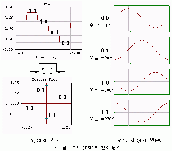 무선통신에서는 PSK 혹은 BPSK의 확장된 개념인 QPSK가 많이 사용된다. BPSK가 1과 0의 두가지 신호만을 구분하는 프로토콜인 반면, QPSK는 4가지의 디지털 신호를 구분한다. 다음장의 <그림 2-7-2>에서는 QPSK의 원리를 보여주고 있는데, 00, 01, 10, 11의 4가지 2bit 디지털 신호를 전송할 수 있기 때문에 이론적으로 같은 시간내에 BPSK보다 2배의 데이터를 전송할 수 있다. 결과적으로 BPSK가 반송파의 위상을 180도씩 바꾸어가면서 전송했다면 QPSK는 90도씩 위상을 변화시켜서 4개의 신호를 만들어내게 된다. 이렇듯 M=4인 MPSK 즉, 4 PSK와 같은 의미가 되기 때문에 QPSK 라고 불리운다.
