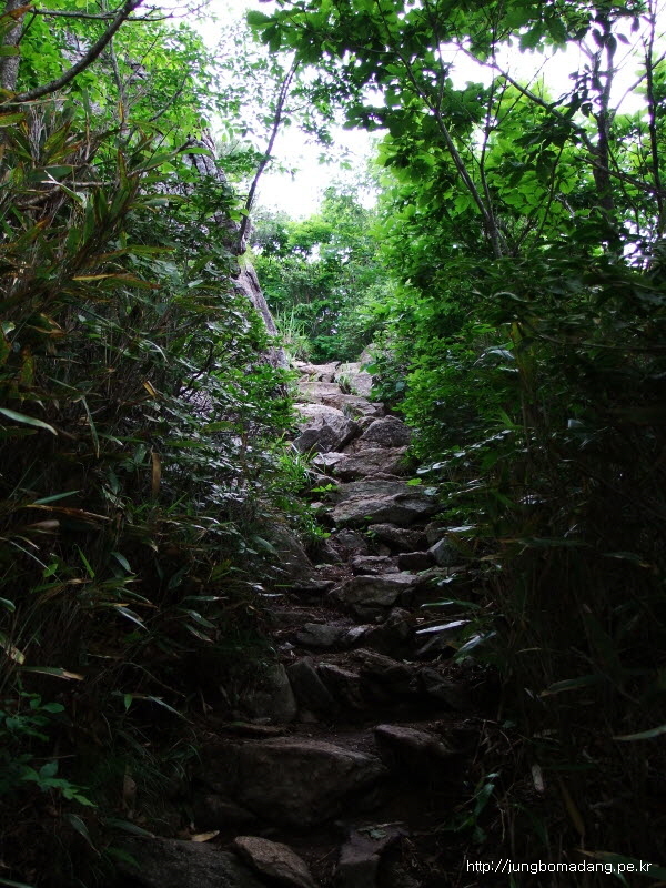 서북능선은 비오거나 안개가 끼었을 때 별로 추천하고 싶지 않습니다. 이런 조릿대길처럼 좁은 길을 상당수 지나야하는 데, 그 잎사귀에 있는 물기가 몸에 묻어서 몸이 온통 젖곤 하거든요... 글고 싸구려 우비는 하나 마다 더라구요... 이런 구간 지나면, 찢기고 그럽니다.