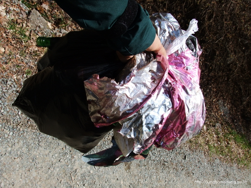 13:08 짬짬히 수집한 쓰레기가 한가득이네요... 비닐봉지를 작을 걸 가져왔더니 후회 막급입니다. 오늘 산행을 하러 온건지, 사진을 찍으러 온건지, 쓰레기를 주우러 온건지 헤깔립니다. ㅎㅎㅎ 담엔 봉다리를 큰걸 가져와야 겠습니다...!