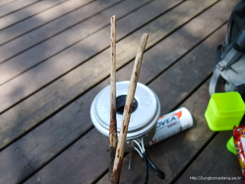 13:46 텐트친 사람도 없고, 살짝 배도 고파서 나무젓가락을 만드는 수고를 기꺼이 합니다... 야영데크 위에서(취사가능!) 숟가락이 없어 라면만 한개 끓입니다. 냠냠~ 아주 꿀맛이네요...