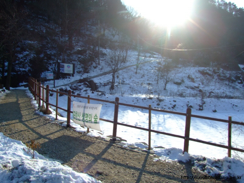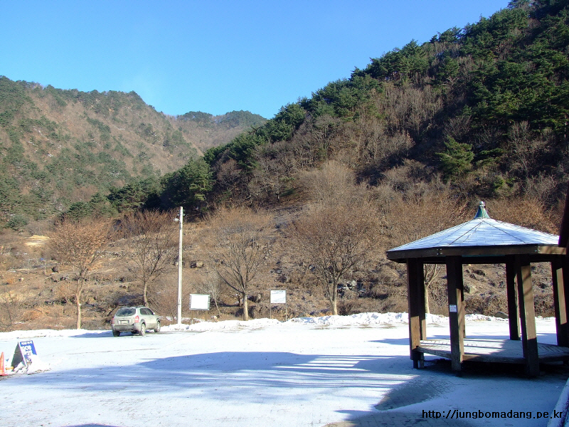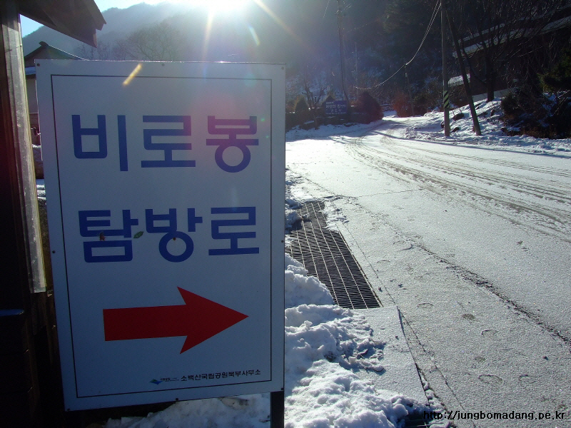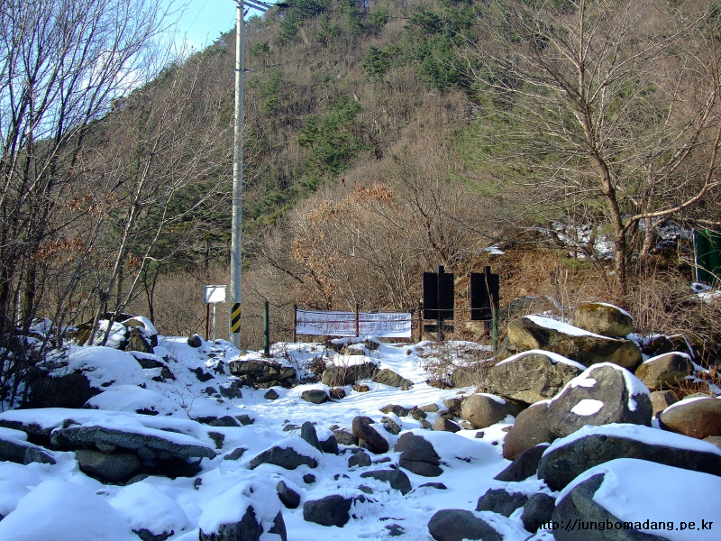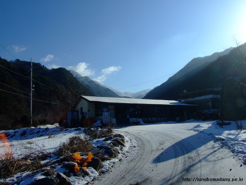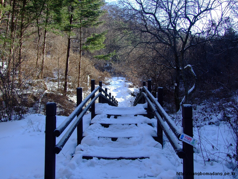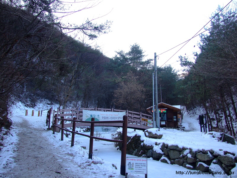 09:38 아직까지는 눈이 많지 않아 아이젠 없이도 진행 가능 하다. 사진에 통제소도 보이는 데, 다리를 건너가도 되고, 안그래도 되지만, 다리를 건너준다.
