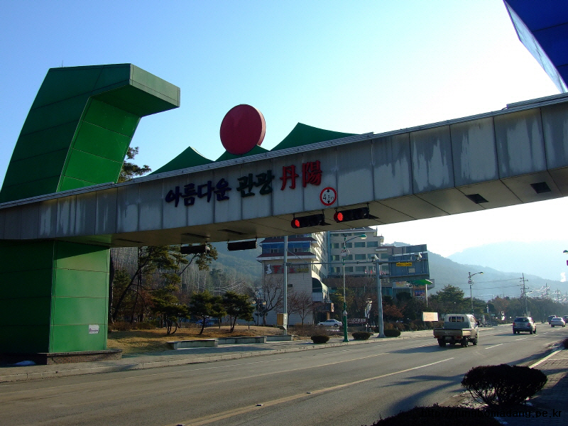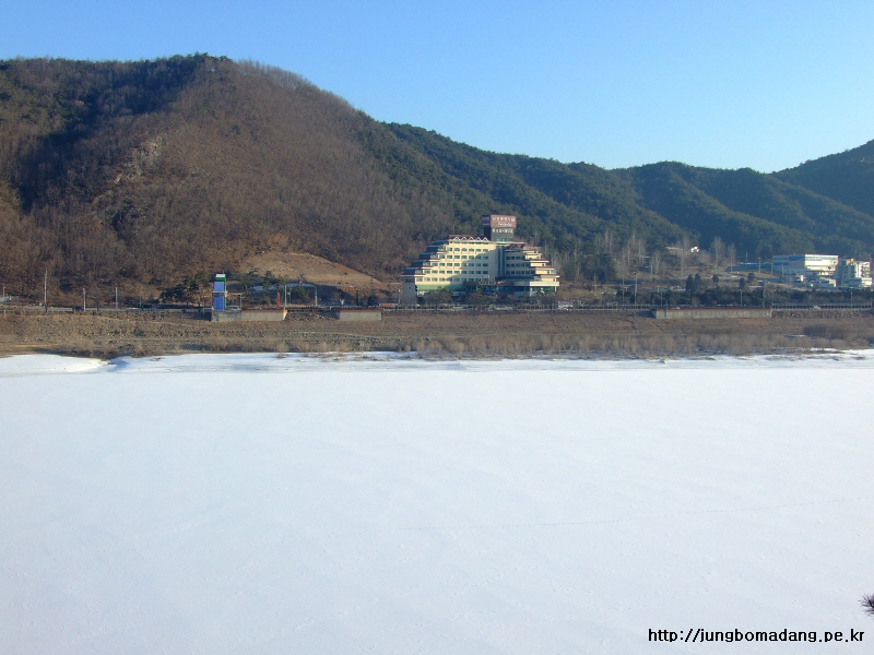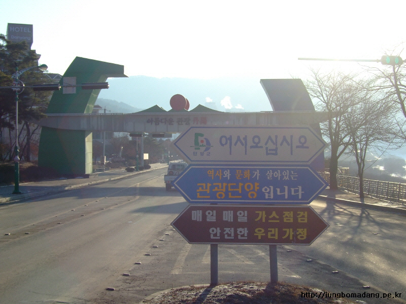 다리를 건너면서 찍은 사진으로 아래 중앙의 큰 건물은 단양관광호텔로 그 앞을 지나 우측에 물류센터 앞 도로 정류장까지 이동해야 한다.