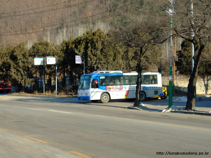 버스 정류장 앞에서 보면 반대편 정류장이 보이고, 노란 지게차가 보이는 데, 그쪽으로 버스가 들어갔다가 곧바로 나오게 된다.