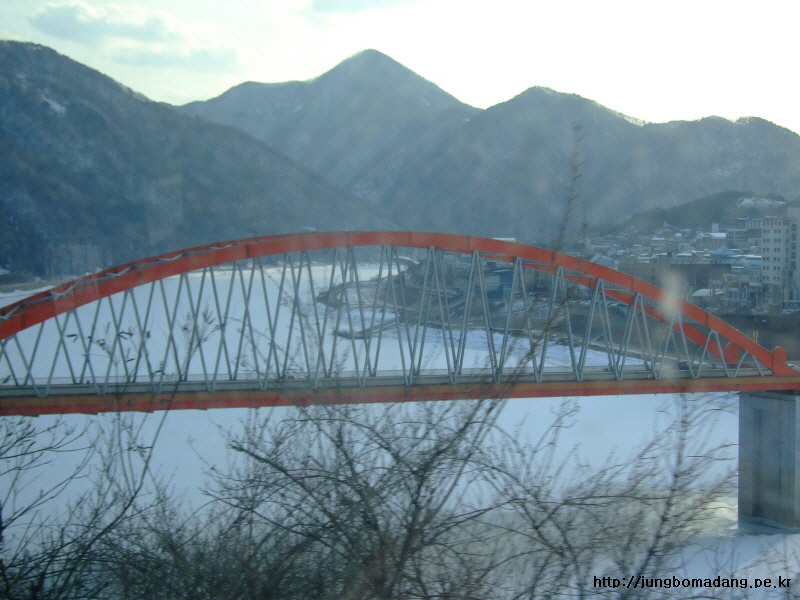 다리를 건너면서 찍은 사진으로 아래 중앙의 큰 건물은 단양관광호텔로 그 앞을 지나 우측에 물류센터 앞 도로 정류장까지 이동해야 한다.