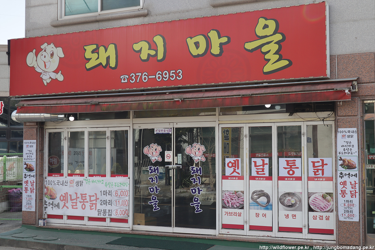 식당에서 제공되는 무료 자판 커피를 호록 호록 마시다 보니 문득 궁금해진 건너편 식당 - 돼지 마을인데 장어랑 치킨은 왜 파는 걸까? 흠..