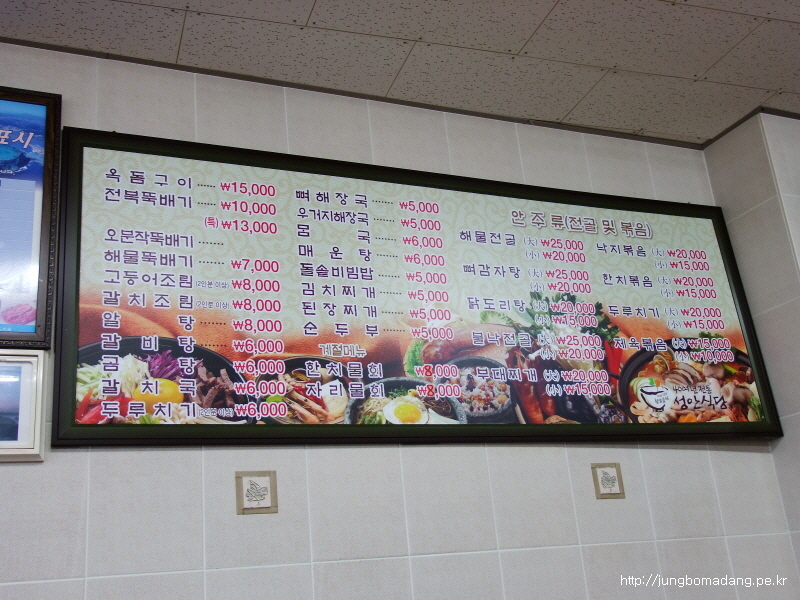 13:33 애월항 근처에서 40년 전통이란 간판에 이끌려서 무심코 들어간 식당! 원래는 물회를 먹고 싶었지만, 물회는 여름에만 나오는 계절 음식이라고 해서 좀 째려보다가 해물뚝배기(7000원)를 주문하고 자리에 앉았다.