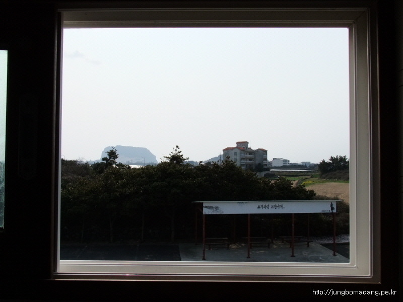 화장실 창문 밖으로 성산일출봉이 보인다.