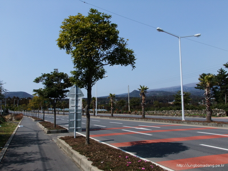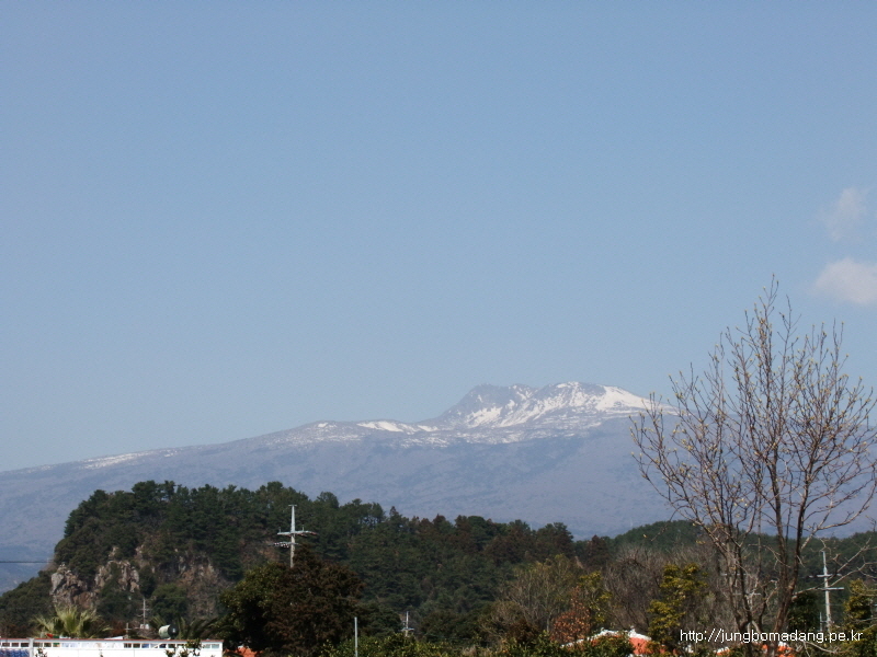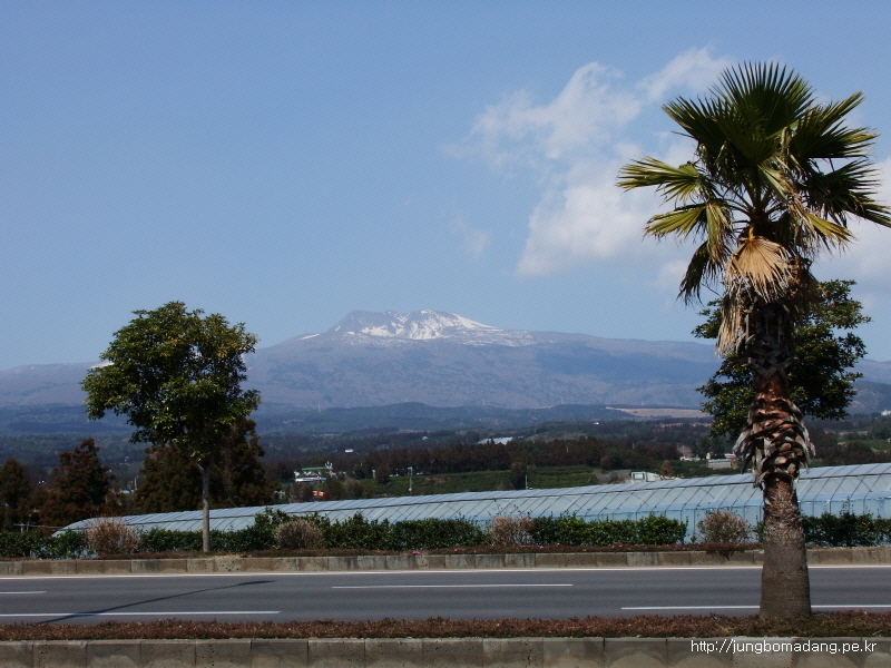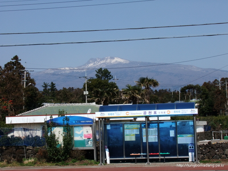 공천포 버스정류장 뒤로 한라산이 보인다.