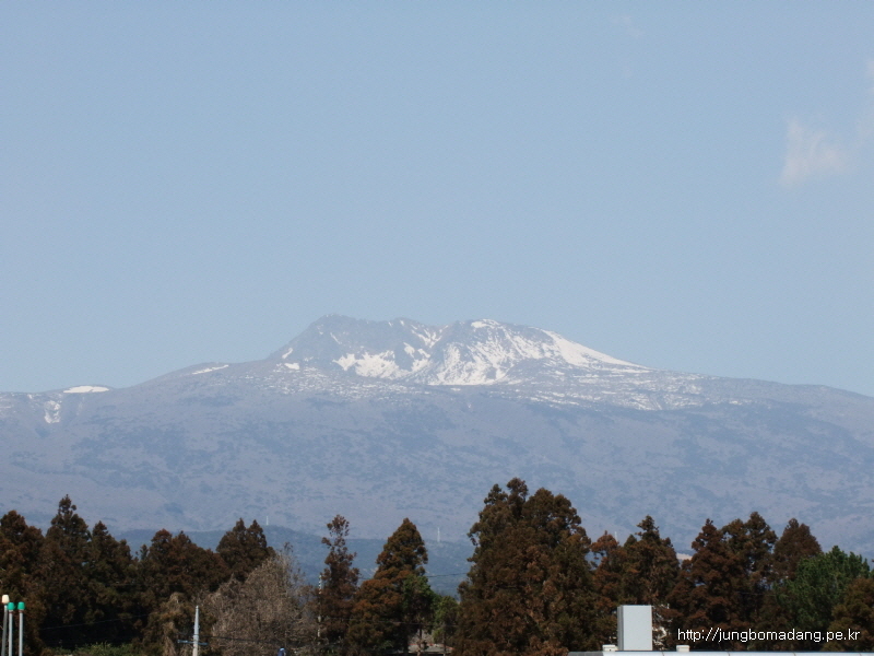 11:43 버스정류장에서 잠시 빵과 사이다를 섭취한다. 한라산을 바라보니 정상쪽에는 눈이 있는지 하얗다.