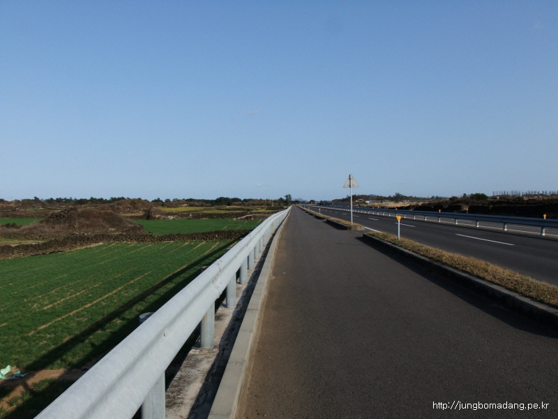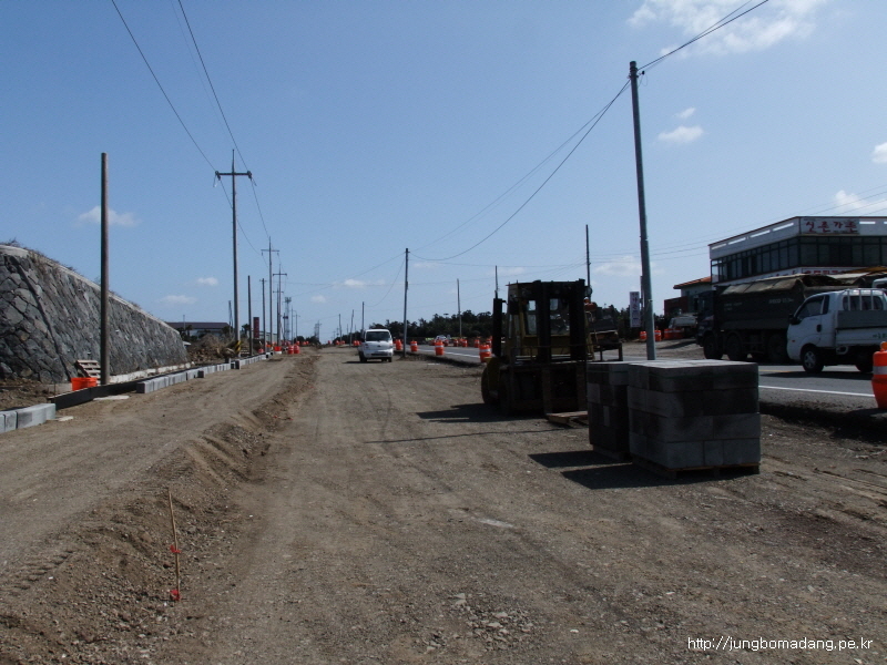 12:08 함덕서우봉 갈림에서 성산방향으로 진행. 여기서부터 좁은 갓길로 진행해야 하지만, 다행히 옆에 공사구간에 여유가 있어 그쪽으로 진행한다.