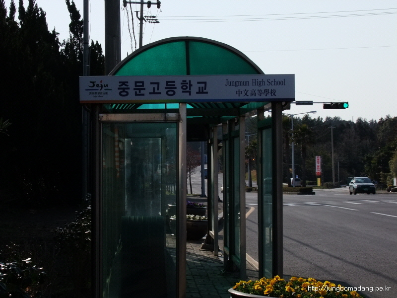 16:00 드디어 중문 근처에 온건가? 중문고등학교 정류장에서 잠시 쉬었다 가기로 하고....