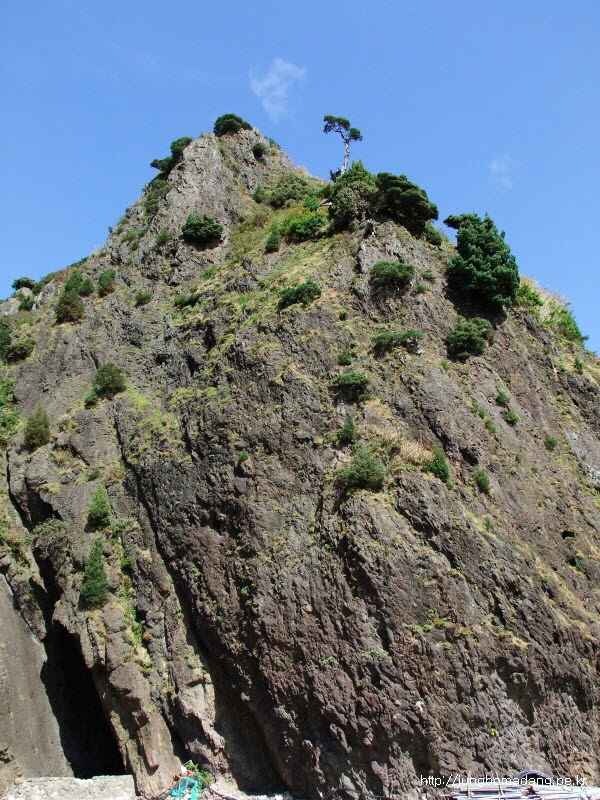 우뚝 솟은 바위 위에 향나무가 꿋꿋히 서있다.
