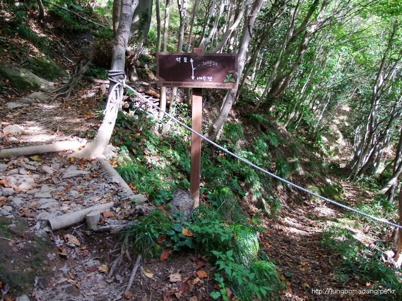 13:37 내수전약수터 갈림길... 여기서도 잠시 가방은 휙~ 던지고 약수터(우측길)를 다녀오기로 한다.