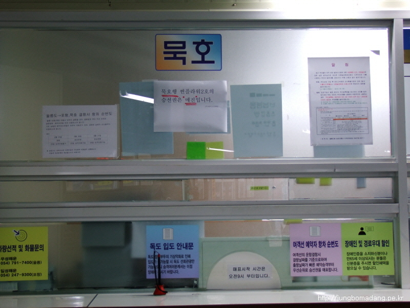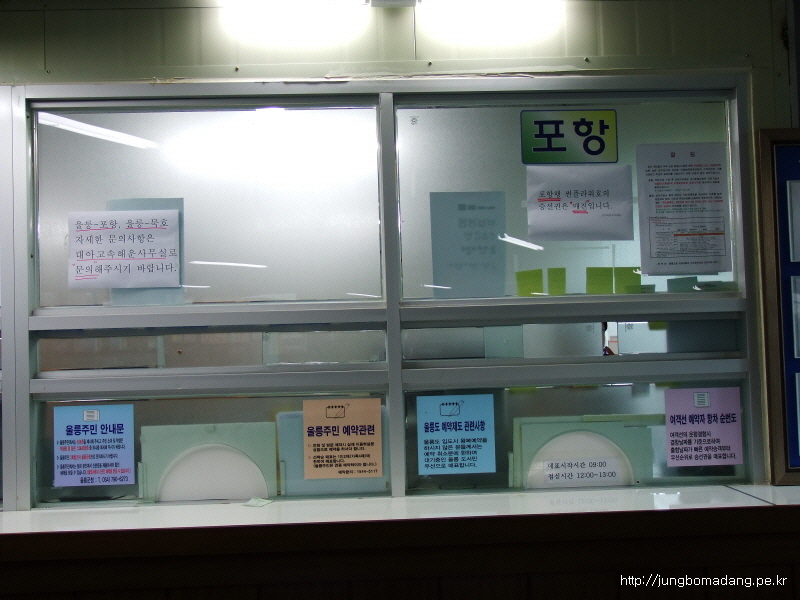 15:15 사동항 도착! 근데 이 조용한 분위기는 뭐지? 알고보니 독도행 막배가 떠나서 매표창구도 모두 닫혀있는 상황! 할 수 없이 다시 독도행 선박회사에 다시 전화해서 우여곡절끝에 독도행은 취소를 무사히 하게 되고, 모든 일정을 접고, 여기서 버스를 타고 도동항으로 가서 1박을 하고 오전 일찍 터미널에서 대기하고 표를 발권받기로 했다.