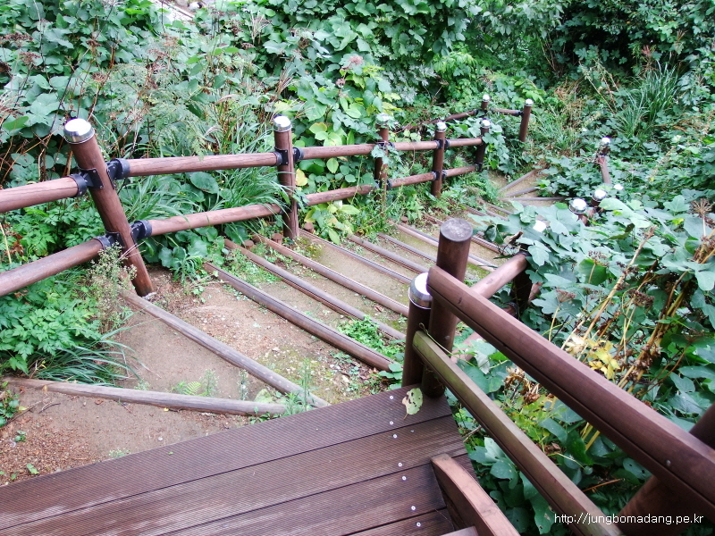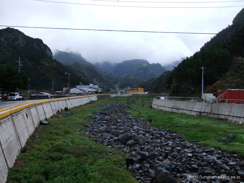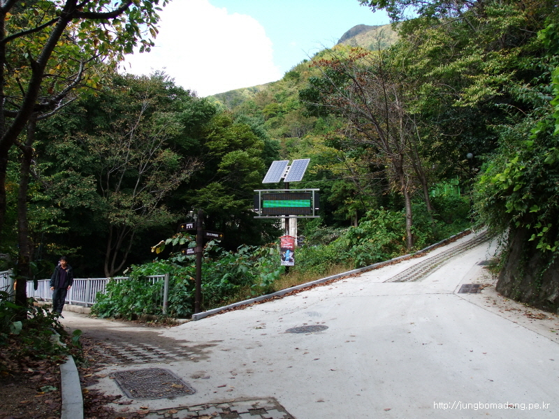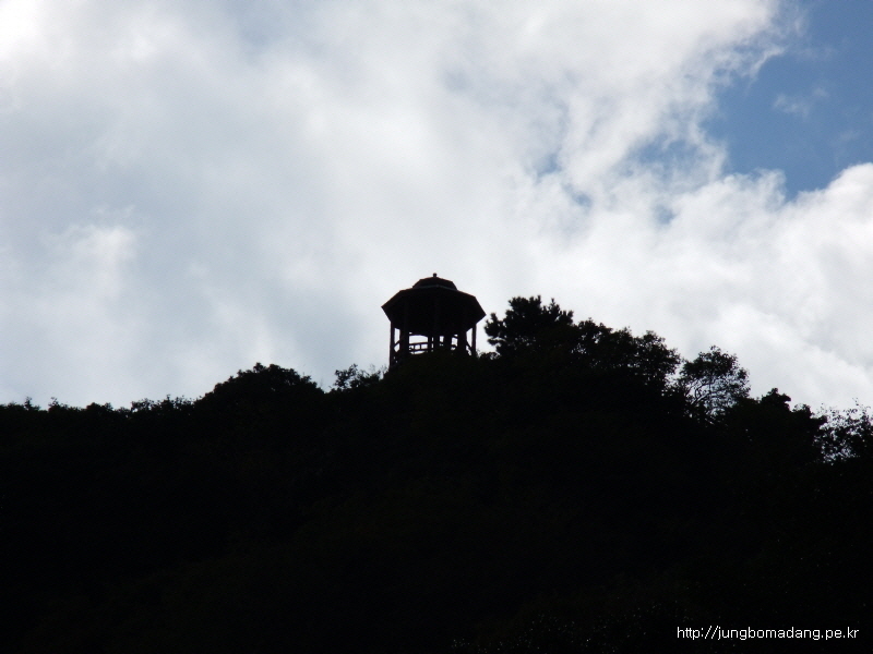 11:00 아뿔사.... 여기서 비가 제대로 내린다... 우산도 없는 데, 일단 급한대로 앞에 보이는 안내판 처마 밑으로 피하고, 가방에 배낭커버를 씌운뒤 잠시 비가 멎기를 기다리는 데, 금방 개일것 같지가 않고...