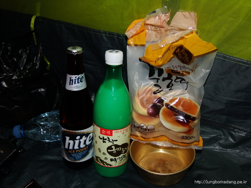 낮에 먹고 남은 빵과, 막걸리, 그리고 맥주... 아~ 행복하네요. 먹기전에 여기 저기 쑤시는 곳에 맨소래담도 발라 주고용...