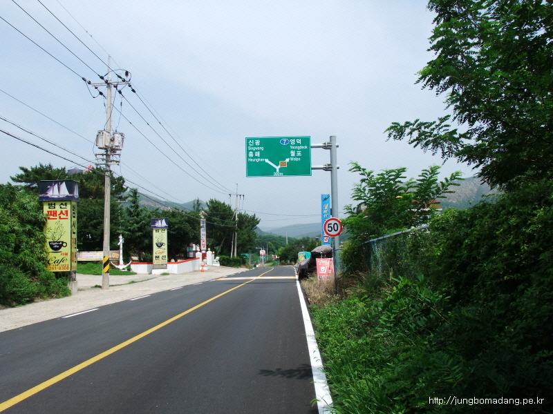 26코스 | 16.2 | km | 168.4 | 43.3 | 망양정~울진엑스포공원~연호공원~곡해교 건너 우측 정자(10.3Km[43.25Km]) or 온양2리마을회관앞해변(10.75Km[43.7Km])~봉평해변~죽변등대[5.45Km or 5Km] |
