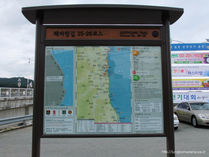 | 26코스 | 16.2 | km | 168.4 | 43.3 | 망양정~울진엑스포공원~연호공원~곡해교 건너 우측 정자(10.3Km[43.25Km]) or 온양2리마을회관앞해변(10.75Km[43.7Km])~봉평해변~죽변등대[5.45Km or 5Km] |