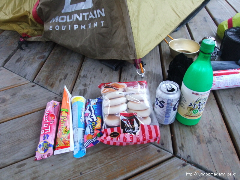 이중 맥주캔은 벌써 뱃속에 넣었고, 그담에 아이스크림 4개를 헤치운뒤 재빠르게 빵과 막걸리를 챙겨 재빠르게 텐트 안으로 들어갑니다. 왜냐면. 모기가 있기 때문이죠.... 저녁엔 취사 하지 않습니다. ㅎㅎㅎ
