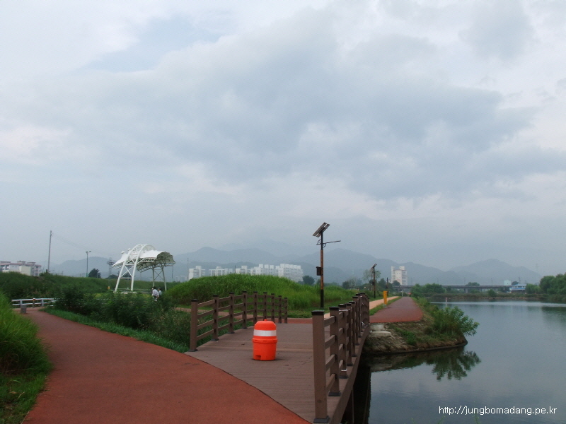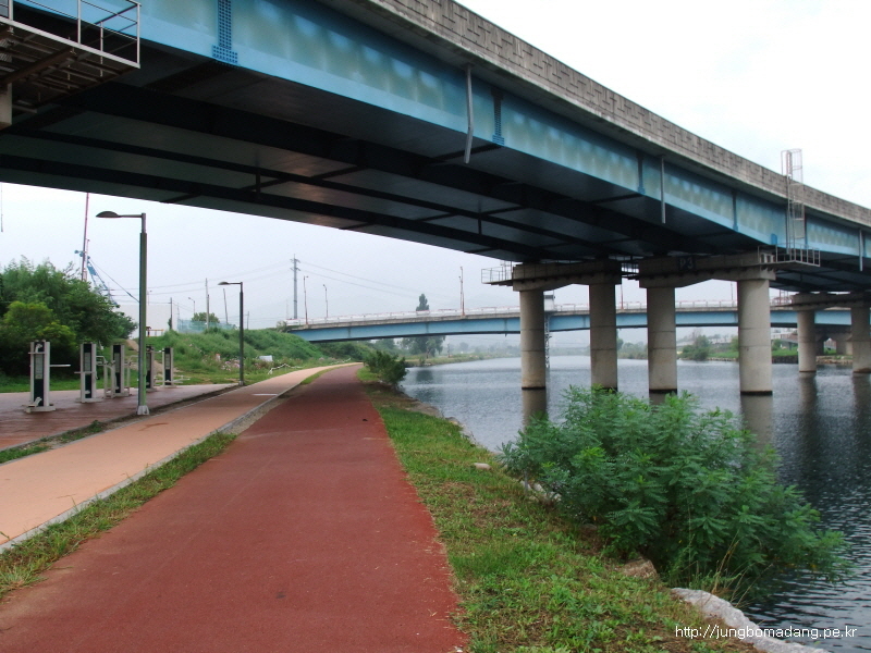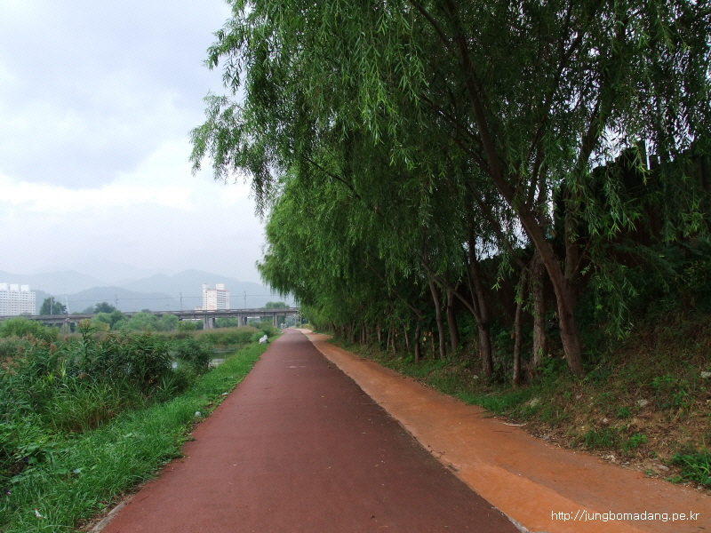 오십천교를 지나고, 강변 산책로를 따라 걷는 데...